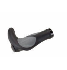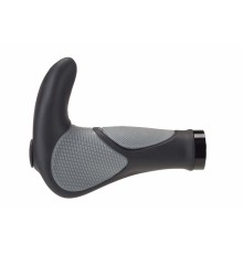 Manopole ergonomiche in gomma a doppia densità con appendici integrate, fissaggio al manubrio mediante collarino in alluminio, lunghezza 140 mm, colore nero/grigio.