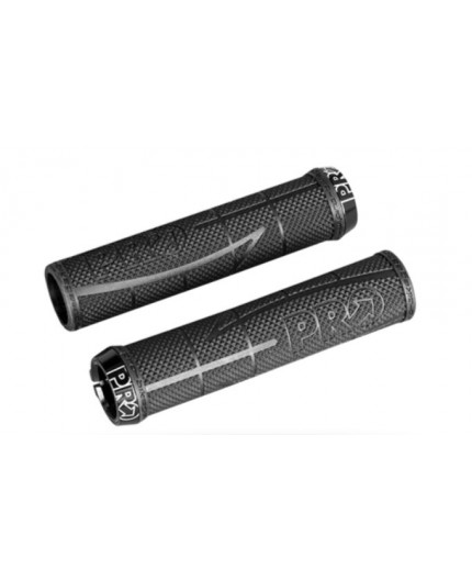 Manopole ergonomiche in gomma a doppia densità con appendici integrate, fissaggio al manubrio mediante collarino in alluminio, lunghezza 140 mm, colore nero/grigio.