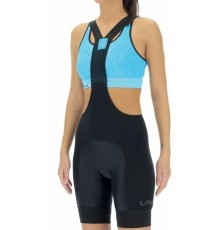 Salopette taglio al vivo, costruzione anatomica, bretelle con elastico lavorazione jaquard morbidissima e schiena inserto in tessuto leggero forato Space. Elastico posizionato interno/coscia per una maggiore stabilità.Cuciture piatte 4 aghi.